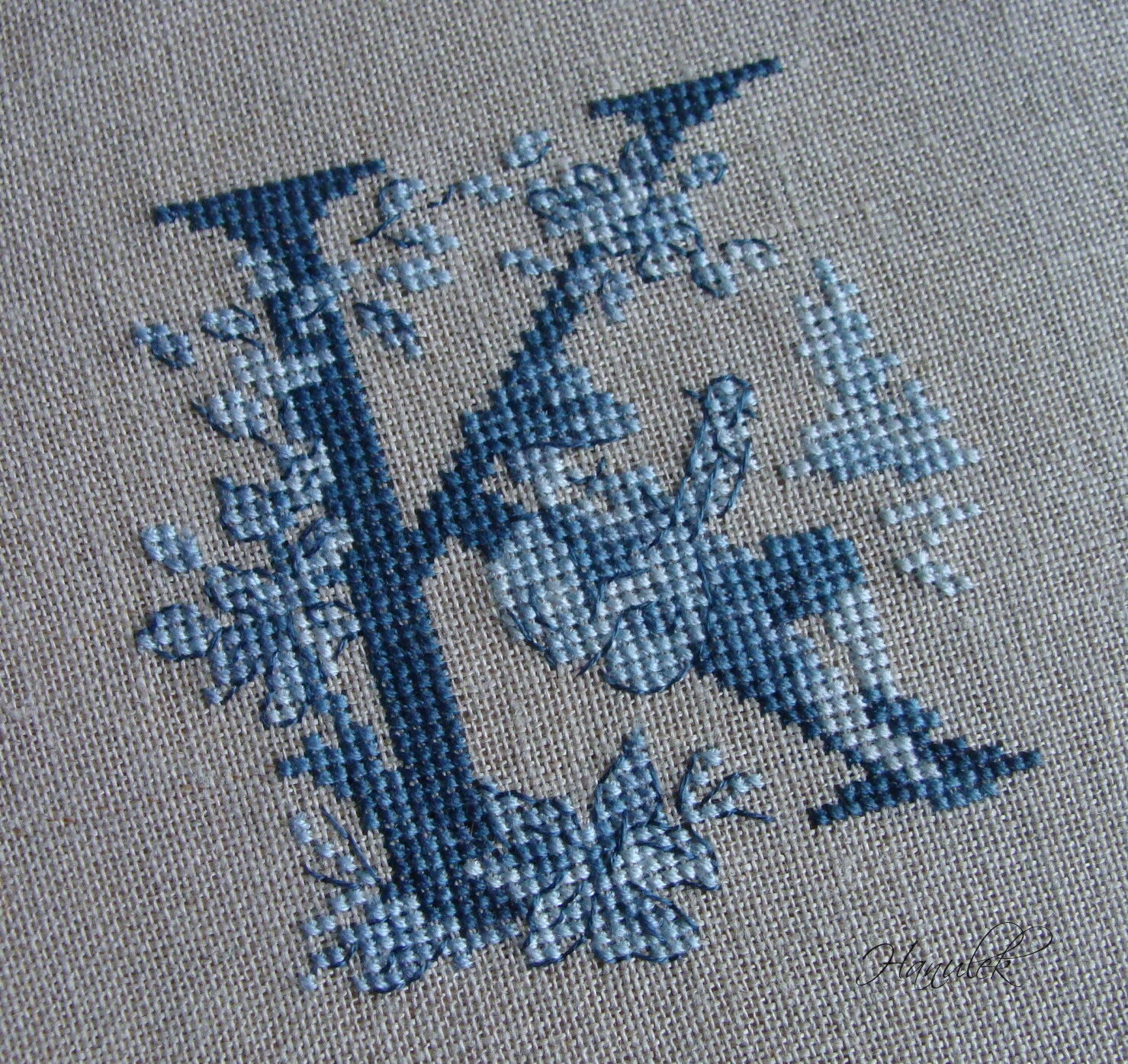 Monogramy wyszyłam na lnie Zweigart Edinburgh 35ct w kolorze Flax. Kolor czerwony według legendy, niebieskości sama dobierałam. Z moim monogramem miałam trochę zabawy - oryginalny z literką H mi nie pasowała, więc na własne potrzeby przerobiłam literkę E ;) Monogram dla Męża to strzał w dziesiątkę - zwłaszcza dla gitarzysty ;)